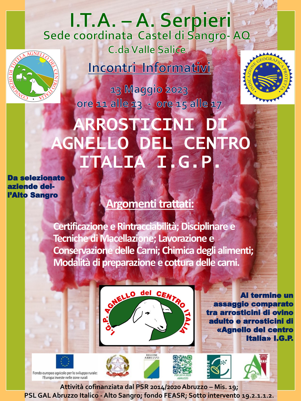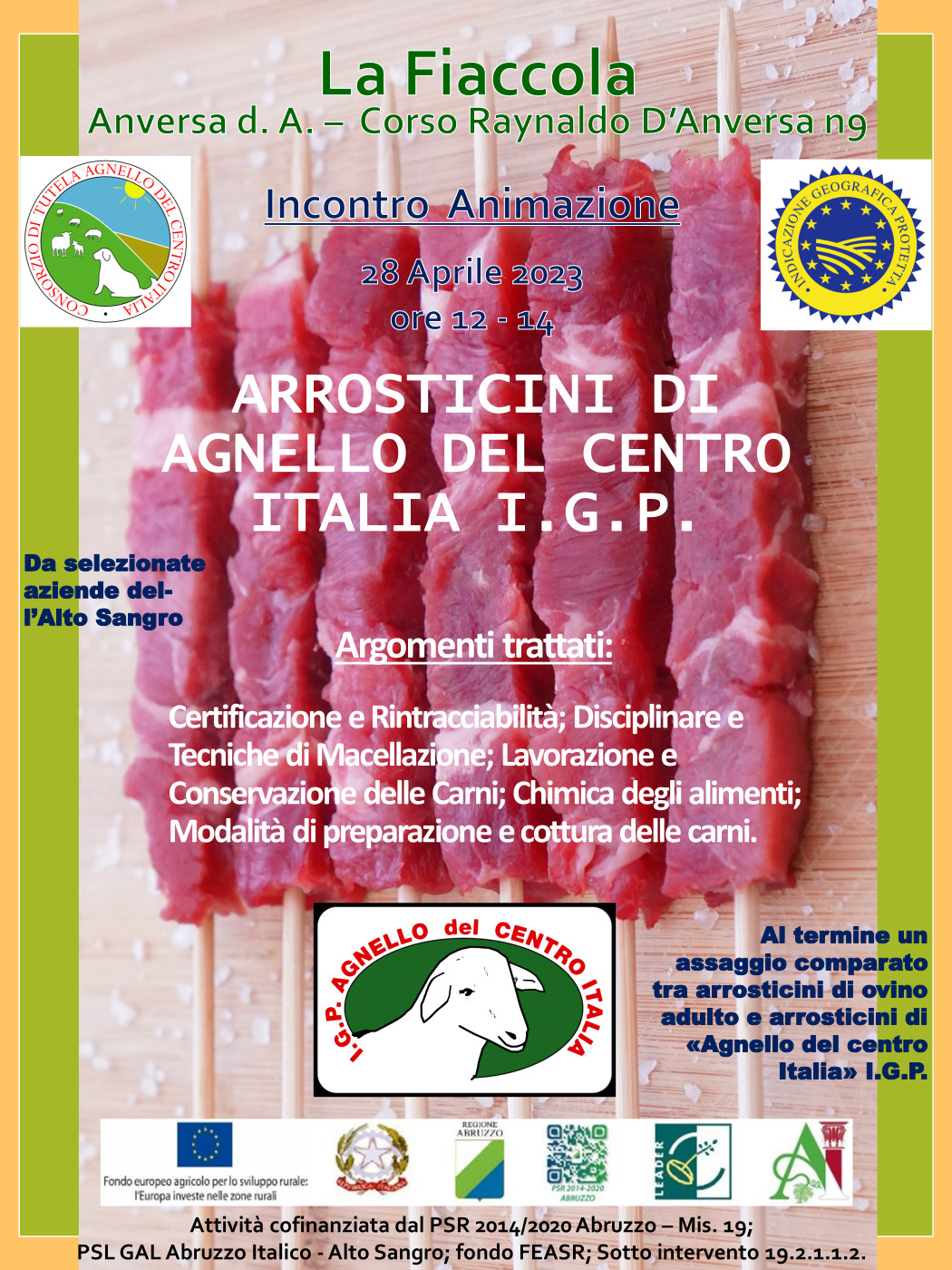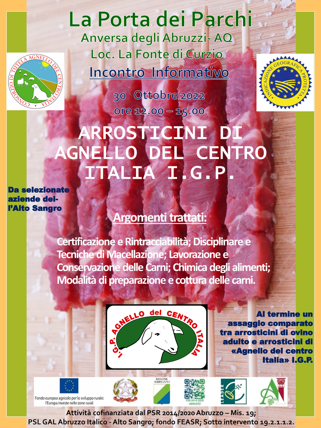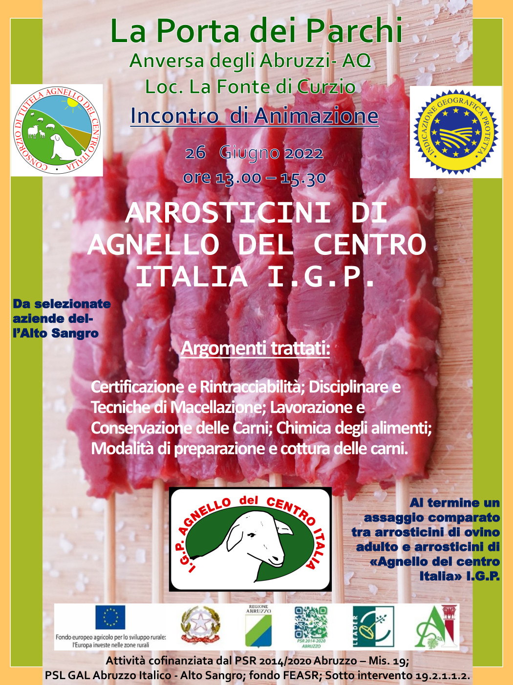 L’iniziativa tende far conoscere la qualità delle carni di agnello, anche attraverso il consumo di arrosticini, 100% di origine Abruzzese, favorire un maggiore consumo, della carne di agnello di qualità certificata, di sicura origine locale, particolarmente idonee per i bambini, a partire dal loro svezzamento ma anche nella fase dello sviluppo, per gli sportivi e per gli anziani.
