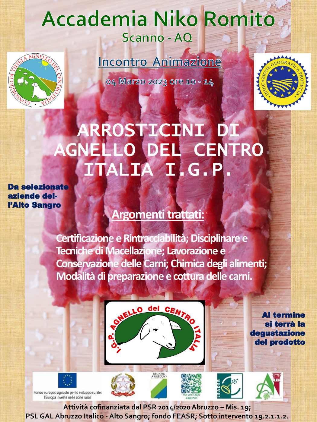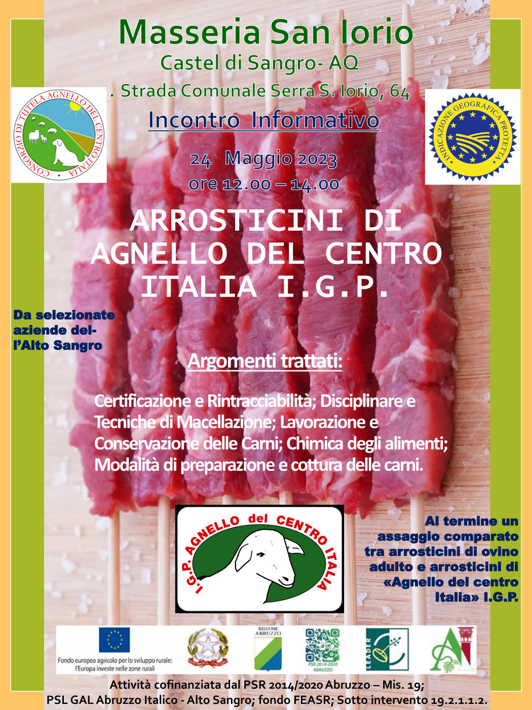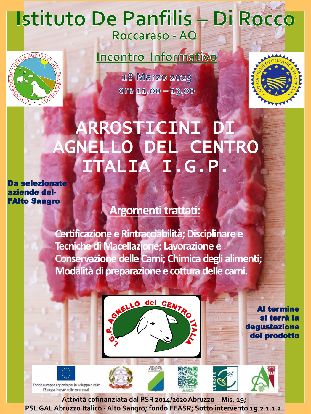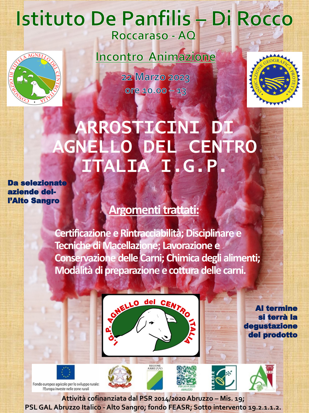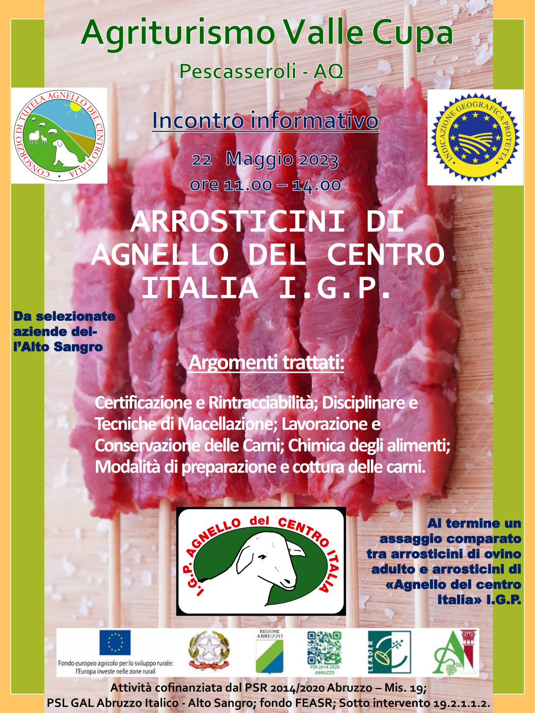 L’iniziativa tende far conoscere la qualità delle carni di agnello, anche attraverso il consumo di arrosticini, 100% di origine Abruzzese, favorire un maggiore consumo, della carne di agnello di qualità certificata, di sicura origine locale, particolarmente idonee per i bambini, a partire dal loro svezzamento ma anche nella fase dello sviluppo, per gli sportivi e per gli anziani.